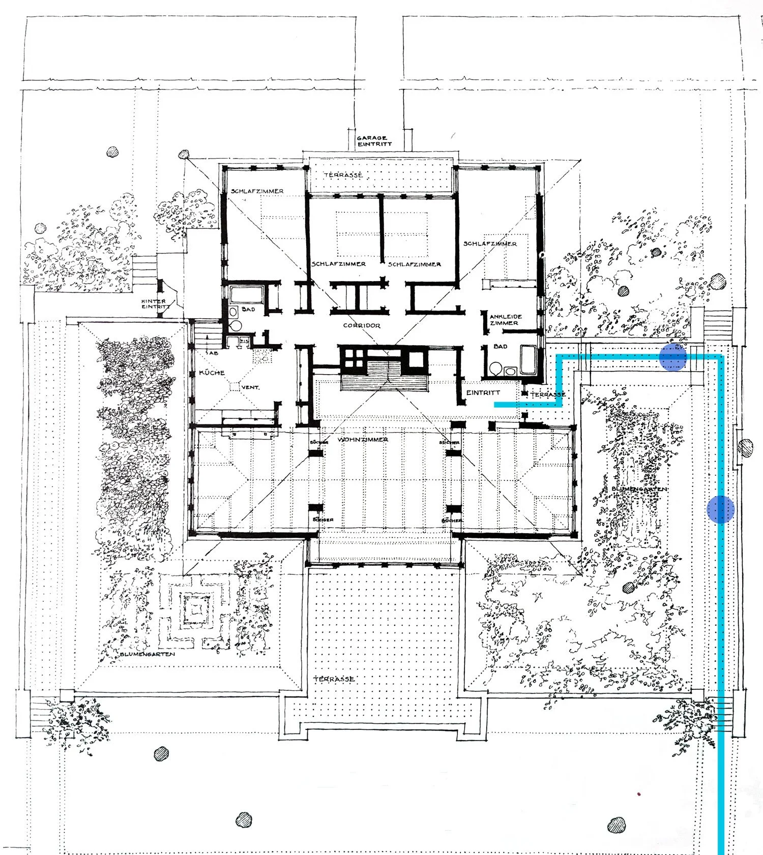 Wright is known for designing hidden front doors in his prairie houses that can only be discovered by traversing winding entry paths. The example shown below of the Cheney house entry walk contains much of the same mystery-discovery as a walk through the woods. Here, Wright weaves us into his suburban landscape and his architecture, egging us on to discover what is around the next bend, tree, brick pier or door. Wright clearly sought to play to a human preference for a limited novel experience; in this case, the eventual discovery of the front door!