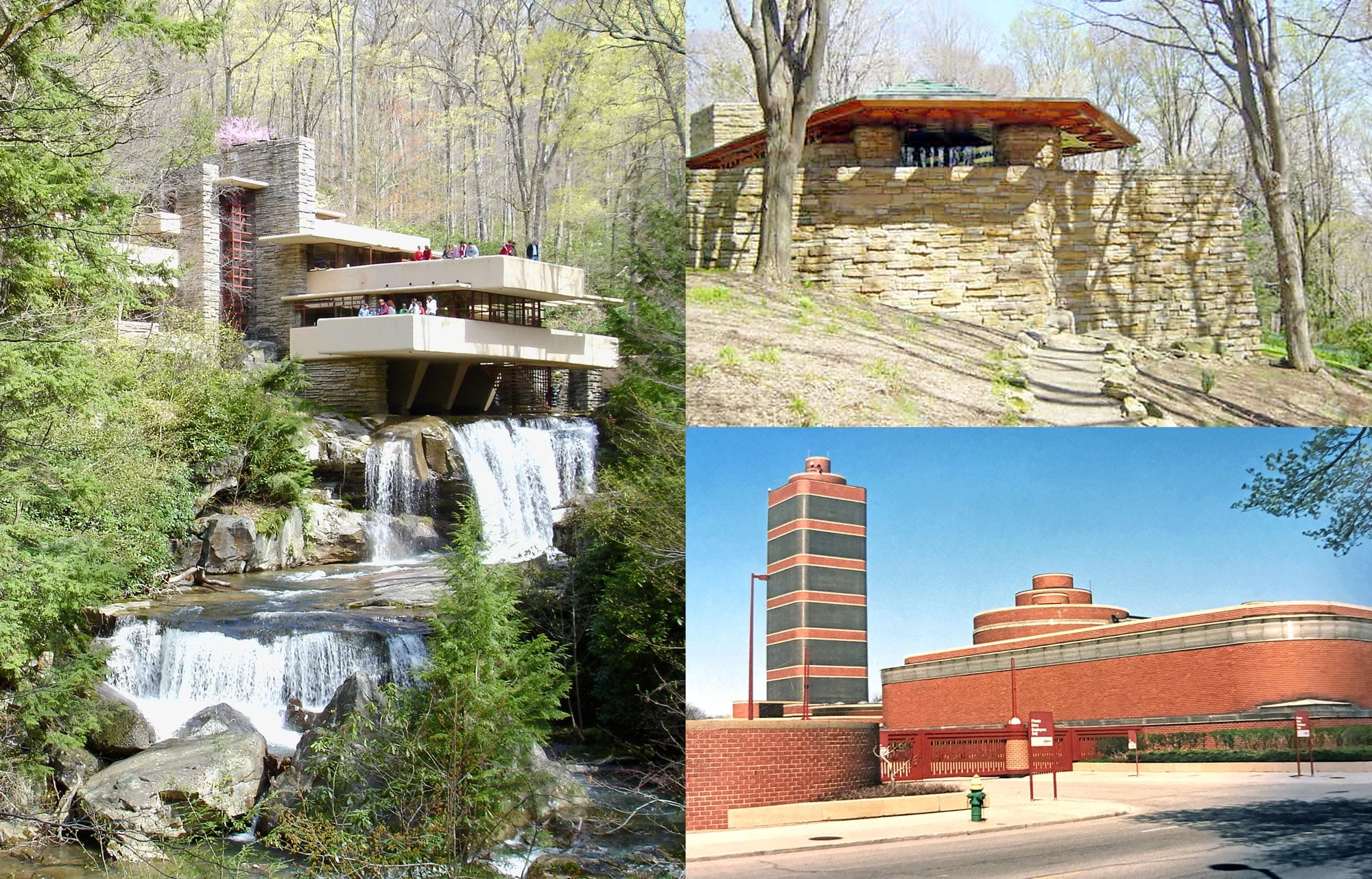 Frank Lloyd Wright’s Fallingwater in Stewart Township, Pennsylvania (1936), Kentuck Knob (top, right) in Chalkhill, Pennsylvania (1953), and Johnson Wax Headquarters in Racine, Wisconsin (1939).