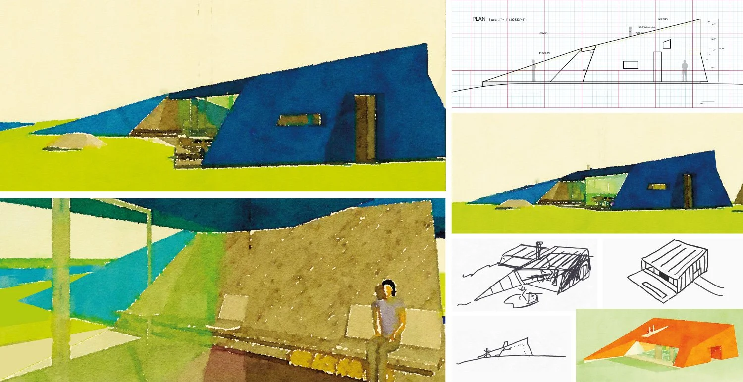 Early concepts of the slab-on-grade type. Note the sympathetic continuation of the house floor slab out to the site. Upper right elevation shows a tapered privacy wall that continues the hill line up through the roof profile. Middle right drawing depicts a pared-back version of the slab-on-grade type.