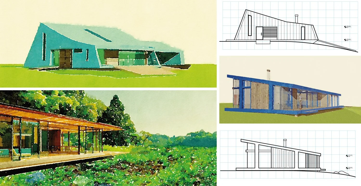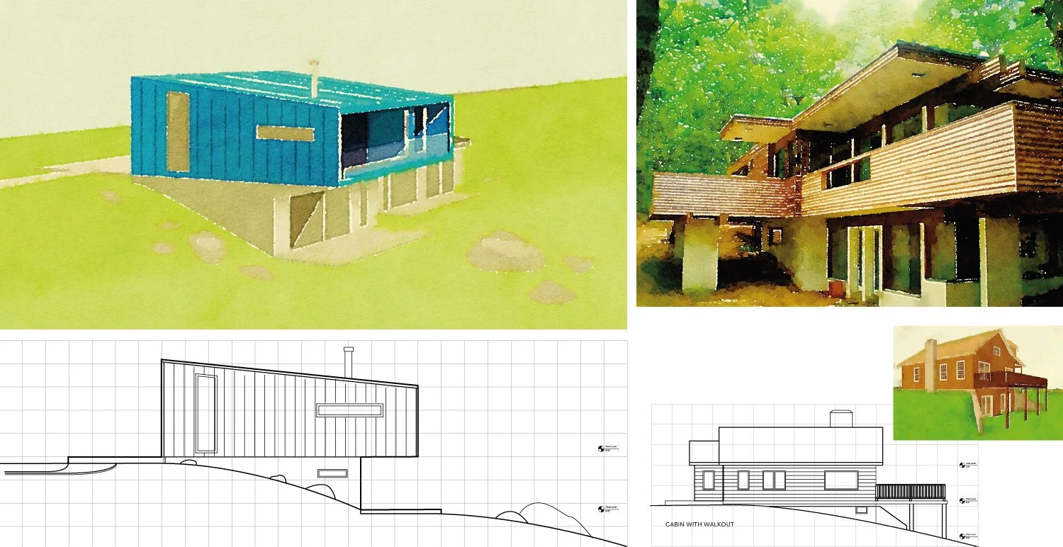 Our local zoning setback falls around 25 feet before the crest of the lakeside slope. So, the topography of our site left us with a bit of latitude for how we could merge a house with the landscape. Some of the options would bring us closer to the land, while others would get us closer to the lake. Here are a few types we played with: