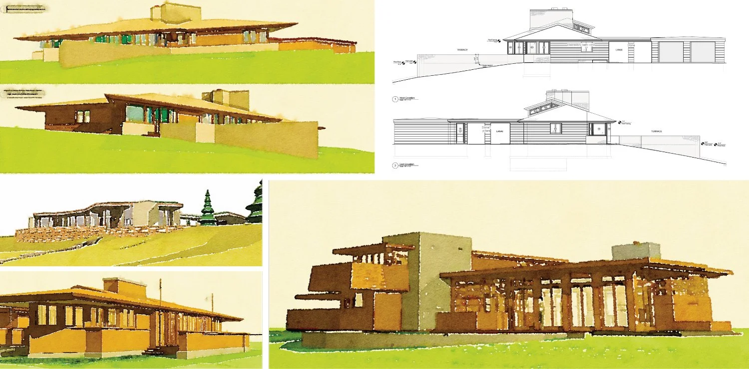 Examples of this type include Frank Lloyd Wright’s Kraus house (top), Gordon house (lower right), Wright-inspired solar hemicycle (middle left) and Prairie-style cottage (lower left).